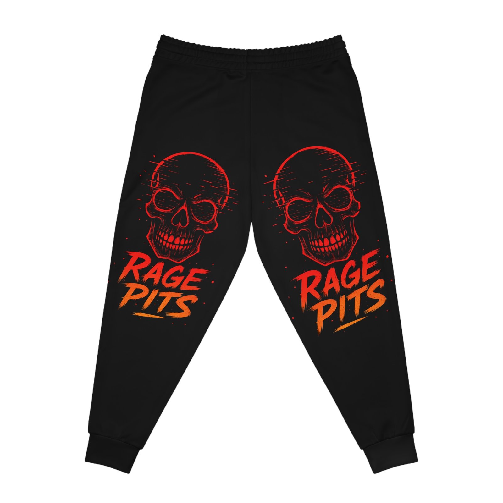 These joggers bring a raw, high-energy edge to casual wear. The black, all-over print features a fierce red skull and bold “RAGE PITS” lettering that sits low on the legs — a look made for movement and attitude. Soft, stretchy fabric drapes easily during warm-ups, mosh-offs, or late-night runs. The drawstring waist and double-layer side pockets keep your essentials secure while the medium-weight knit holds shape and prints vibrantly. Wear them to shows, practice sessions, or when you want street-ready comfort that speaks loud without saying much.