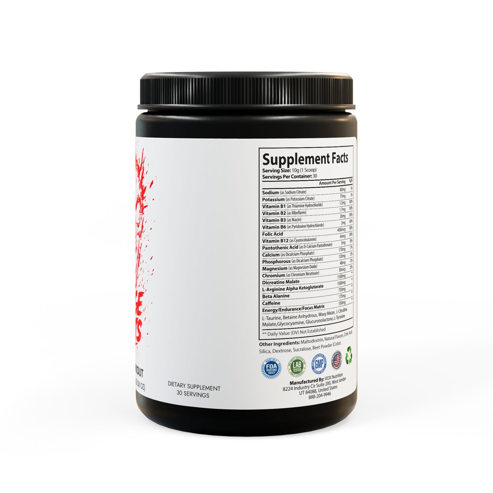 Ingredients: Sodium (as Sodium Citrate), Potassium (as Potassium Citrate), Vitamin B1 (as Thiamine Hydrochloride), Vitamin B2 (as Riboavin), Vitamin B3 (as Niacin), Vitamin B6 (as Pyridoxine Hydrochloride), Folic Acid, Vitamin B12 (as Cyanocobalamin), Pantothenic Acid (as D-Calcium Pantothenate), Calcium (as Dicalcium Phosphate), Phosphorous (as Dicalcium Phosphate), Magnesium (as Magnesium Oxide), Chromium (as Chromium Nicotinate), Dicreatine Malate, L-Arginine Alpha Ketoglutarate, Beta Alanine, Caffeine, L-Taurine, Betaine Anhydrous, Waxy Maize, L-Citrulline, Malate ,Glycocyamine, Glucuronolactone, L-Tyrosine. Other Ingredients: Maltodextrin, Natural Flavors, Citric Acid, Silica, Dextrose, Sucralose, Beet Powder (Color).